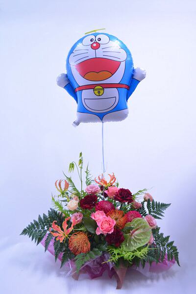 シックな赤の色合いでまとめたアレンジメントに 浮くドラえもんがポイントです。